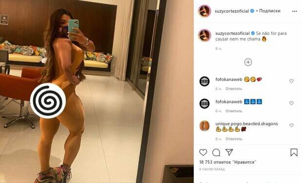 Об этом пишет Politeka.net со ссылкой на страничку знаменитости. Фанаты поставили более 3 тысяч лайков и написали комментарии: "Привет, красотка", "Замечательно выглядит", "Я твой большой поклонник", "Два таких прекрасных механизма - это роскошно", "Детка", "красивая женщина", "Я люблю твои ноги детка", "Красивая ты, чудо", "Я люблю тебя, Сьюзи Кортез", "Это твое божественное", "Спокойной ночи красивая", "Мне нравится нажимать, мне нравится делать поцелуй драгоценным", "Моя любимая, люблю это", "Мамочка красивая", "Какое супер чувственное тело", "Вау, просто вау", "Вкусная кобылка !!!", "Какие ножки красивее". Сообщалось, что 29-летняя бразильская модель Сьюзи Кортес похвасталась пикантным образом. Кортес регулярно хвастается перед поклонниками своим шикарной фигурой. На этот раз Сьюзи превзошла сама себя. На опубликованном кадре модель представала в обтягивающем костюме, который создавал иллюзию полной наготы. Напомним, хозяйка самых красивых ягодиц ужаснула перекаченными ногами А еще Politeka писала, что хозяйка самых красивых ягодиц Сьюзи Кортес в трусиках задрала ноги выше головы Также Politeka сообщала, что хозяйка самых красивых ягодиц удивила естественным видом в ванной
