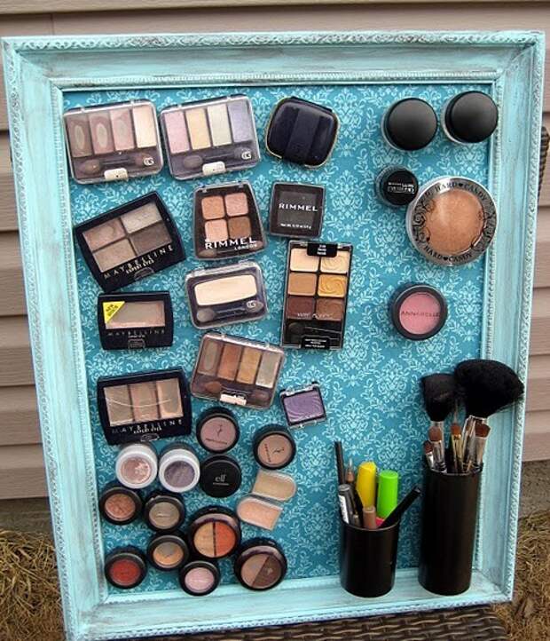 Где и как вы обычно держите тени, пудру, помаду, кисточки и тысячи других нужных женских вещичек для макияжа? Скорее всего, где-то на столике или трюмо, в каких-то ящиках, корзинках или сумочках. Быстро найти нужную коробочку бывает сложно, особенно утром в спешке. Поэтому вместо горизонтального хранения предлагаю подумать над вертикальной организацией домашней косметички.