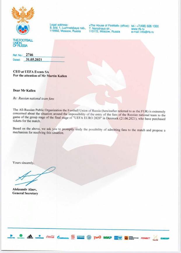 «Общероссийская общественная организация «Российский футбольный союз» крайне обеспокоена ситуацией вокруг невозможности допуска болельщиков сборной России, которые приобрели билеты на матч, на игру группового этапа Евро-2020 в Дании. Просим вас оперативно изучить возможность допуска болельщиков на матч и предложить механизм решения проблемы», — говорится в письме Алаева в УЕФА. Фото: sport-express.ru Запрет на посещение российских болельщиков стадиона в Копенгагене может быть связан с рекомендациями Совета Евросоюза. В частности, для пересечения границ ЕС разрешено допускать лишь граждан, прошедших вакцинацию одобренными в Европе вакцинами. Российские «Спутник V», «ЭпиВакКорона» и «КовиВак» — в число одобренных не входят. При этом по решению правительства России иностранные болельщики смогут посетить матчи в Санкт-Петербурге. Для этого зарубежным гражданам будет достаточно оформить Fan ID и иметь при себе отрицательный ПЦР-тест на коронавирус. Напомним, сегодня сборная России сыграет контрольный матч с Польшей в рамках подготовки к ЧЕ-2020. Встречу в прямом эфире покажет телеканал «Рен ТВ». Игра со сборной Дании в рамках 3-го тура группового раунда ЧЕ-2020 пройдет 21 июня в Копенгагене.