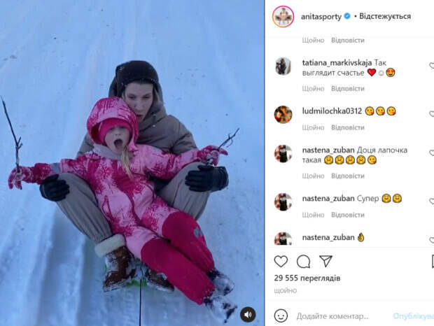 Тренер украинского шоу «Зважені та щасливі» Анита Луценко показала, как проводит время с маленькой дочкой Как сообщает Politeka.net, у себя в Инстаграм звезда опубликовала короткий ролик, посвященный зимним развлечениям. На видео Анита дурачилась со своей четырехлетней дочкой Мией. Сначала мама обсыпала снег с деревьев, после чего долго катала малышку на санках.