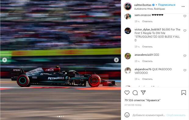 Первое место в квалификации Гран-при Мехико занял пилот Mercedes Вальтери Боттас. 7 ноября трансляция заезда велась на F1 TV. Вальтери Боттас завоевал поул-позицию, опередив напарника по команде Льюиса Хэмилтона на 0,145 секунды. Пилоты Red Bull Racing не смогли навязать борьбу Mercedes. Перед трибунами с соотечественниками мексиканский пилот Red Bull Серхио Перес занял только четвертое место.