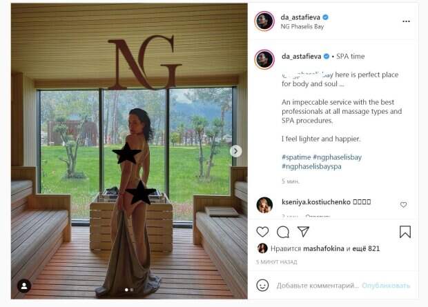 В этот раз Даша позировала в почти невидимом бикини возле большого окна в сауне. Астафьева с выгодного ракурса посветила роскошными формами, спустив полотенце. "Время СПА... идеальное место для души и тела ... Безупречный сервис с лучшими профессионалами во всех видах массажа и SPA-процедурах. Я чувствую себя легче и счастливее", - написала артистка. Всего за пять минут публикация собрала более 800 лайков. "❤️