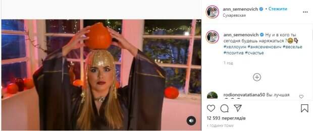 net. На Анне – золотой парик и темно-фиолетовый шелковый халат. Она сидит за столом с зажженными свечами и тыквами. Видео начинается с того, что Семенович держит на голове тыкву и шатается из стороны в сторону. Затем она произносит фразу: «Сладости или гадости?» и желает поклонникам крутого Хеллоуина. Отметим, что образ ведьмы Анна дополнила соответствующим макияжем: подведенными глазами и темной помадой на губах. «Ну и в кого ты сегодня будешь наряжаться ?
