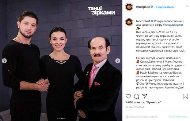 Им предстоит исполнить сразу три танца: один со своим партнером, второй – с одним из судей проекта, а также финальный «танец за жизнь», который выберут для пары путем жеребьевки. В частности, Наде Мейхер предстоит станцевать самбу с 90-летним Григорием Чапкисом. На новом фото певица и ее текущий партнер Кирилл Васюк позируют рядом со знаменитым танцором. В свою очередь, Санта Димопулос и Макс Леонов исполнят румбу с судьей-джокером Павлом Вишняковым. Юлии Саниной и Дмитрию Жуку предстоит станцевать венский вальс с Владом Ямой. А Сергей Мельник с Аделиной Дели встанут на пуанты с Екатериной Кухар для того, чтобы показать балетные па. Украинцы бурно обсуждают предстоящий выпуск программы. При этом некоторые переживают, что паре Нади Мейхер может быть тяжело из-за возраста ее нового партнера. «Бедные участники....дай им энергии и желания выдержать столько танцев и репетиции», «Кто бы сомневался, что Чапкис с Надеждой будет танцевать», «Санте и Наде не повезло без обид, не смогут они показать в таком тандеме свой потенциал», «Остались только сильные пары, прям очень сильные за всё сезоны», «Яму прифотошопили?», «Хотелось бы увидеть, например, от пары Санты и Нади хип-хоп, а то почти все время бальные танцы», - пишут люди. Напомним, роман вспыхнул на "Танцях з зірками", влюбленные больше не скрывают чувств: "Ради нее я готов рвать всех". Как сообщала Politeka, новый скандал сотряс "Танці з зірками", Яма и Чапкис решили потрепать нервы: "Хватит спасать Мейхер!". Также Politeka писала, как выглядят сильнейшие пары «Танців з зірками», захватывающие кадры: «Очень горячо».