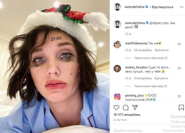 Известная российская актриса Кристина Асмус ошарашила кадрами, на котором видны «последствия» Нового года Как рассказывает Politeka, фотографией знаменитость поделилась у себя в Instagram. «Доброе утро. Как дела?» - поинтересовалась она у поклонников. На снимке можно заметить растрепанную и помятую Асмус, которая с «размазанным» лицом и шляпой Деда мороза якобы только проснулась.