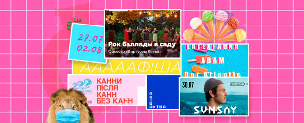 А теперь представьте, как он читает собственные произведения на террасе с видом на Подол 😍. Такое бывает не часто, а в период карантина - так вообще редкий случай.Поэтому всем ценителям творчества Жадана и просто тем, кто слишком скучает без дела, билеты - здесь 👈.Closer jazz: Dennis Adu Quintet📅 29 июля, 20: 00-22: 00📍 Closer, ул. Нижнеюрковская, 31 (Киев)💸 300 грнНаконец начинают оживать культовые места для отдыха в столице 😜.Арт-клуб Closer, который известен своими рейвами и нестандартными выставками, открывает серию летних концертов на террасе 💕. Как вы поняли, чтобы не в закрытом помещении и с соблюдением всех карантинных норм.Первым мы услышим джаз в исполнении музыкантов Dennis Adu Quintet. Это как раз та команда, которая играет современную, чувственную, виртуозную музыку. Среди участников - звездный трубач Деннис Аду. У музыканта множество наград и преподавательская практика в академии Глиера. Короче, не профан, как вы поняли 😆.Билеты - здесь 👈.SunSay. Спонтанный концерт📅 30 июля, 19: 00-21: 30📍 Терраса Всі. Свої, ул. Десятинная, 12 (Киев)💸 400 грнАй, какое же лето без красивой и душевной музыки 😮. Особенно, когда ее играет SunSay - бывший участник группы 5'Nizza и участник Нацотбора на Евровидение. Его выступление тоже планируется на террасе с видом на Подол. Как вы поняли, это и безопасно, и круто, и мило, и еще множество "и ...и...и...".Билеты на приятный концерт - здесь 👈.Кричать! Звать! Гореть! Украинская кинореклама 1920-30-х📅 30 июля - 2 августа, 12: 00-19: 00📍 Довженко-Центр, ул. Васильковская, 1 (Киев)💸 на кассеСто раритетных киноплакатов, которые анонсировали выход украинских и зарубежных лент почти век назад 😯. Это уникальные экспонаты, которые говорят не только о мастерстве тогдашних художников, но и, порой, вообще остаются единственным упоминанием о том, что определенный фильм существовал в украинской истории.Плакаты оставляли на стенах в городах и селах, чтобы привлекать внимание людей к киноиндустрии. Поэтому они должны были быть яркими, "громкими", но одновременно вместительными и информативными. Представьте себе, что это аналог 10-секундных реклам на наших телевизорах, только в подаче людей с 30-х годов. Интересно взглянуть на креатив прошлого, да? 😁Кто интересуется не только лентами прошлого, но и их дистрибуцией - это именно ваша тема. Но и другим не помешает увидеть выставку, потому что уже засиделись дома, уверены 😁.LATEXFAUNA, ADAM, Our Atlantic - open air📅 31 июля, 18:00-22:00📍 HC HALL, ул. Освободителей, 1 (Киев)💸 от 200 грнХотя концертов нам еще не разрешили (в том смысле, к которому мы все привыкли - забитые залы и тесные обнимашки), музыканты нашли способ встречаться со своими слушателями.Некоторые проводят концерты на крышах, а некоторые - на открытых площадках с ограниченным количеством посетителей. Именно таким будет сет выступлений от украинских инди-групп LATEXFAUNA, ADAM и Our Atlantic.Во-первых, это качественная музыка. Там и народные мотивы, и английские фанковые нотки, и немного абсурдных текстов. Во-вторых, за концертом можно будет наблюдать с пуфов, стульев и даже шезлонгов 💕.Добавим сюда бар с холодными напитками - и все уже поднялись с диванов.Билеты - здесь 👈.Канны после Канн без Канн📅 31 июля, 19:00-22:00📍 UNIT.City, ул. Дорогожицкая, 3 (Киев)💸 бесплатно"Каннские львы" - это любовь.Именно так скажут украинские креативщики и специалисты качественной рекламы. Потому что это самая престижная награда для мальч