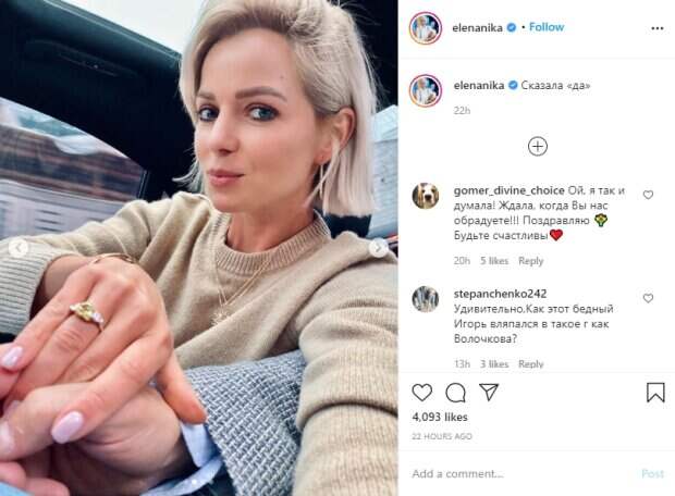 Игорь Вдовин развелся с Анастасией Волочковой в 2017 году, а вскоре стал выдающимся предпринимателем и заставил балерину пожалеть о расставании. Несколько лет назад у мужчины начался роман с журналисткой, которая оказалась на 23 года моложе его. Стоит отметить, что Елена Николаева хорошо общалась с дочерью Волочковой - Ариадной. На снимках телеведущая запечатлена в машине с обручальным кольцом на пальце. Будущая невеста нежно касается руки своего возлюбленного и вся светится счастьем, но сам Вдовин в кадр не попал. Пользователи социальной сети в комментариях предположили, что балерину шокирует новость о свадьбе ее бывшего супруга: "Волочкова будет в бешенстве