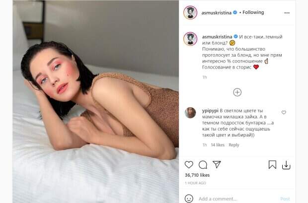 Кристина Асмус развалилась на кровати в вязанном коричневом топе, который пикантно обтянул ее бюст, и с томным взглядом подперла голову руками. Звезда сериала "Интерны" сделала себе вызывающий макияж с ярко-красными тенями, румянами и помадой. "И все-таки... темный или блонд?