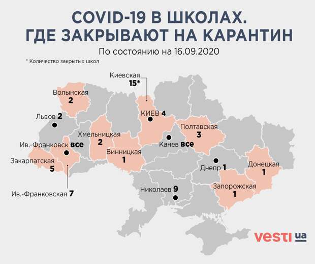 Киев В столице с начала учебного процесса на карантин закрыли уже 4 школы. На дистанционное обучение перевели 164 класса. В первых числах сентября на карантин ушли две школы, в которых у педагогов выявили коронавирусную инфекцию. Школа № 18 Учебно-воспитательном комплексе "Социум" №240 Еще 133 класса в 56 школах перевели на дистанционное обучение из-за заболевания учеников. Днепр В Днепре закрыли на карантин учебное заведение № 137. У пяти педагогов школы обнаружили коронавирус. Учеников перевели на дистанционное обучение до 27 сентября. Львов Во Львове от коронавируса умер директор школы №31 Омелян Цар. Об этом сообщили в пресс-службе ЛОДА. Ранее по одному классу во львовских школах "Джерельце" и №46 перевели на дистанционное обучение в связи с позитивными тестами у ассистента учителя и одного из учеников. Как сообщил и в пресс-службе Львовского горсовета, предварительно дистанционное обучение детей будет длится 14 дней. На прошлой неделе на карантин во Львове закрыли два детских сада. По состоянию на 7 сентября детсады города посещают 39% от общего числа воспитанников. Ивано-Франковская область В связи с переходом в "красную" зону в Ивано-Франковске все школы перешли на дистанционное обучение. Эту информацию подтвердили в Нацполиции, сотрудники которой следят на соблюдением карантинных ограничений. В полиции заверили, что на данный момент ни одна школа не работает. В Ивано-Франковской области уже 7 школ (из 700) закрыли на карантин. Донецкая область В Донецкой области по состоянию на 15 сентября одна школа и 28 классов перешли на обучение удаленно. Речь идет о Керменечицкой школе (Великоновоселковский район). Стало известно о заболевании Covid-19 5 учеников и 3 учителей, сообщает пресс-служба Донецкой ОГА. Запорожская область В Мелитопольской районе в Мирненской ОТГ на самоизоляцию отправили школу. Черкасская область Канев с 14 сентбря "попал" в красную зону. В городе школы, детсады и внешкольные учреждения прекращают свою работу. Ограничение касается всех учебных заведений, расположенных на территории города, в том числе, Каневского колледжа культуры и искусств и Каневского ВПУ. Школы в настоящее время переходят на дистанционное обучение. Среди школьников города 5 больных с коронавирусом. Также диагноз Covid-19 подтверждена в двух учителей. Волынская область Две школы на Волыни перешли на дистанционное обучение из-за высокого показателя заболеваемости Covid-19. Об этом сообщили в Управлении образования и науки Волынской ОГА. Речь идет о маленькой школе-филиале Турийского района и большом лицее Любешевского района, где все 403 ученики вынуждены учиться дистанционно. Отмечается, что коронавирус выявили у 9 педагогов. Закарпатская область В Ужгороде в Классической гимназии на карантин отправили два класса. В каждом из них Covid-19 заболел по одному ученику. 10 сентября в Закарпатской области заболели по одному ребенку в школе Ужгородa и школе в Мукaчиевском рaйоне. Еще два класса Тячевских школ (5-Б класс Тячевской ООШ I-III ст. №2 и 10 класс ПНВК "Счастливый город") приказами директоров школ перевели на дистанционное обучение с 14 по 18 сентября из-за подозрения на коронавирус у школьников. Полтавская область На две недели остановили работу школы в Диканском и Новосанжарской районах. Некоторые школы продолжают работать, если не было контакта больных с работник