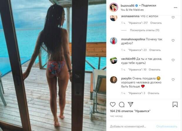 Сейчас на Мальдивах начался сезон дождей, который продлится целых десять дней, однако счастливую артистку это не останавливает и она проводит свой отпуск по полной программе. Бузова также решила поделиться пикантным кадром в одном бикини без лифчика. Она вышла на улицу, посветив бюстом и полюбовалась уже сереющим небом. Поклонники же обратили внимание на неудовлетворительное состояние ее фигуры и заметили, что у Ольги нет лишних килограммов. «Доброе утро ❤️ С 8 утра просыпалась, чтобы не пропустить ни минуты последних дней отдыха... но