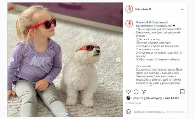 Лилия поведала о собачке Дикси породы бишон фризе. По ее словам, это идеальный питомец, который не портит вещи, ходит в туалет, куда надо, не кусается и не ест со стола. Лилия Ребрик рассказала, что в семье все ссорятся в шутку, кто будет нежиться с питомцем. "Иногда, когда Диана уже спит, я ворую Дикси из детской, чтобы побыла со мной (и так у нас в семье делаю не только я