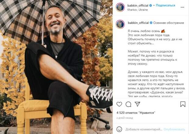 Поэтому под фото Бабкин заговорил о смысле музыки в жизни. По словам артиста, музыка — это язык души, язык сердца, язык аур, тонких слоев, сияний вокруг нашего тела. «Этот язык универсальный, он обладает целебными свойствами. Им владеет каждый из нас, я в этом убеждён. Берегите в себе этот бесценный дар — слышать музыку во всём, наслаждаться ею, грустить и радоваться, смеяться и плакать под любимые песни и мелодии.⠀ Друзья-музыканты, а нам я желаю творить, вдохновляться и вдохновлять, создавать прекрасное и вечное