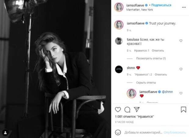 Серьезность образа девушка разбавила пикантной позой. Соня, растрепав распущенные волосы, села на стул задом на перед, при этом широко расставила ножки и несколько вальяжно облокотилась на спинку. Красотка испепеляюще посмотрела куда-то в сторону, от чего аж мурашки по телу. "Доверьтесь своему путешествию", - подписала фото модель. Пользователи кинулись комментировать увиденное: "Боже, как же ты красива!!!"; "Как алмазы в небе!