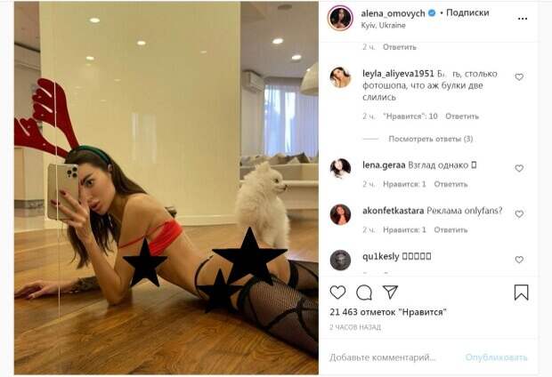 Наряд она задрала, сверкнув частью груди шестого размера. Также для придачи особой пикантности Алена приспустила тонкую бретельку с плеча. Модель надела крохотные трусики, которые напоминали лишь тонкие полосочки, подпрыгнувшие выше ягодиц. Также на красотке были сетчатые чулки. А завершили образ оленьи рога - обруч на голове. Модель выставила упругие ягодицы, а ее маленький пушистый друг встал лапками на них. "Оставайся дома