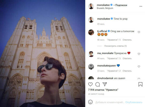 Так, солистка группы Екатерина Павленко у себя в Инстаграм показала себя в Бельгии. Об этом пишет Politeka.net. На фото Катя позирует на фоне одной из достопримечательностей Брюсселя – собора святых Михаила и Гудулы. Величественное строение возвышается над артисткой на фоне голубого неба. Свое лицо Павленко сфотографировала крупным планом. Исполнительница в очках задумчиво смотрит куда-то в сторону. «Пора молиться», - подписала снимок Екатерина. Ее поклонники тут же отреагировали. «Прекрасна», «Два произведения искусства», «Произведение искусства, аж дух захватывает, ну и собор тоже ниче такой», «Катя ты как обычно шикарная», «Выглядишь так эпично», «Шикарная», - пишут люди в комментариях к посту. Напомним, редкое фото юной солистки Go_A взбудоражило Сеть, еще не брюнетка и не звезда "Евровидения". Как сообщала Politeka, солистка Go_A "отличилась" перед Лесей Никитюк, устроив сумасшедшие танцы. Также Politeka писала, что музыканты "Go_A" все в черном откровенно обратились к украинцам.