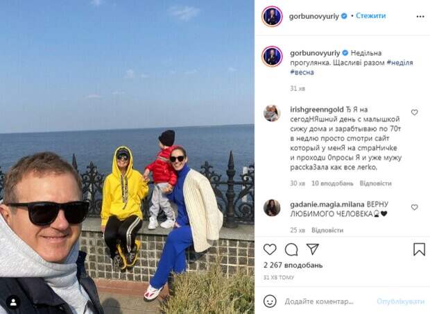 "Воскресная прогулка. Счастливы вместе", - лаконично написал Горбунов под фото. На новой фотографии Горбунов делает селфи, улыбаясь, а позади него на парапете сидят не менее счастливые Ирина и Катя, держа за руки маленького Ивана. "А малышу тоже нужны очки", "Очень красиво! Желаю хорошо отдохнуть", - пишут в комментариях. Следует отметить, что Горбунов и Осадчая довольно часто делятся с фолловерами радостными моментами из своей семейной жизни. В частности, недавно Горбунов показал фото, на котором маленький Иван держится за руль автомобиля. Милое фото пришлось по душе поклонникам Юрия. "С таким водителем папа спокоен! (пока мама не видит)", - написал известный телеведущий. Как известно, Юрий Горбунов был женат на бывшей актрисе балета Ивано-Франковского театра Людмиле, старшей его на 10 лет. В 2011 году стал дедушкой — дочь Ксения родила внучку Полину. В феврале 2017 года Юрий Горбунов и Катя Осадчая объявили, что они официально женаты. 18 февраля 2017 года у супругов родился сын Иван. Напомним, что Осадчая, устроив домашний ресторан, засветила интерьер своего роскошного особняка: "Два забора, камеры и..." Как сообщала Politeka, Горбунов показал забавы с сыночком, пока мама не видит: "настоящий мужчинка! " Также Politeka писала, что "Одноглазая" Осадчая без Горбунова похвасталась, как встречает весну на чужбине: "Катя, везите в Украину"