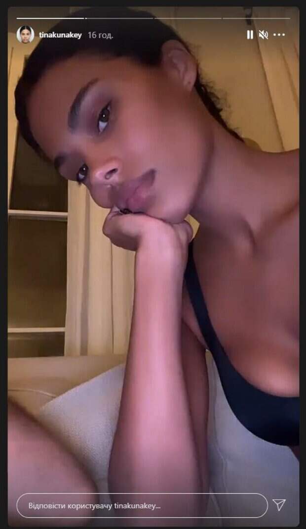 Известная модель Тина Кунаки, молодая супруга Венсана Касселя, показала, как проводит время вечером На фото Тина позирует в топе, который практически не скрыл упругий бюст девушки. Кунаки подперла рукой лицо и смотрела в камеру, снимая себя на телефон. Волосы у красотки были собранными назад, а смотрела грустным взглядом модель прямо в камеру.