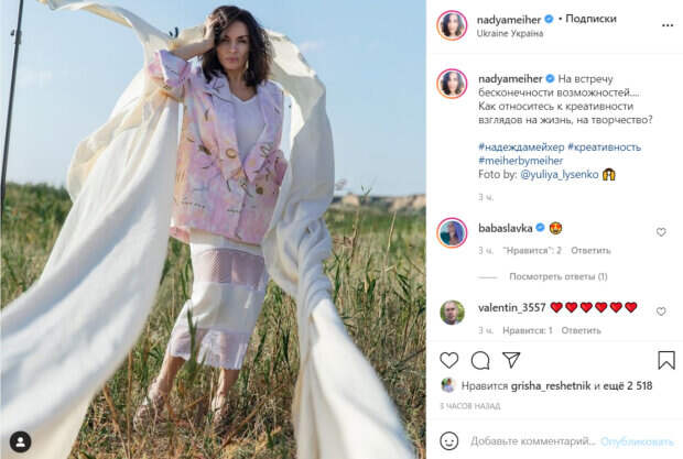 Девушка активно ведет социальные сети и делится с поклонниками моментами из жизни. Об этом передает Politeka.net. Так, на этот раз девушка поделилась новым фото на своей странице в Инстаграм. Как известно, помимо сольной карьеры она занялась магазином одежды, поэтому не редко показывает стильные наряды на публике. На кадре певица в костюме из белой юбки с сеткой, и оверсайзового розового пиджака. Свой образ она подчеркнула белым длинным шарфом, который пускает по ветру и белыми туфлями. "На встречу бесконечности возможностей.... Как относитесь к креативности взглядов на жизнь, на творчество?" Поклонники оценили фото Нади и оставили ей множество приятных слов в комментариях: "Как на самое важное в жизни и у вас вдохновляемся", "Красавица, отличной пятницы тебе", "Максимально положительно! Творчество - это, по сути, и есть креатив. А жизнь, в каком-то смысле, творчество. По крайней мере, так, пожалуй, должно быть". Ранее сообщалось, экс-ВИА Гра Мейхер засветила интересную деталь, приняв смелую позу в светлом боди: "Ну чего, всяко бывает" Также, экс-ВИА Гра Мейхер в белом купальнике засветила татуировку на бедрах: "Уникальный стиль" Politeka рассказывала, ненакрашенная Надя Мейхер хотела похвастаться своим талантом, но вышло наоборот: "Катастрофа"