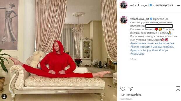 Скандальная российская балерина Анастасия Волочкова напомнила о себе фирменным шпагатом Как пишет Politeka.net, у себя в Инстаграм Анастасия опубликовала домашнее фото в красном спортивном костюме. Она раскорячилась на диване посреди помпезной комнаты. «Прекрасное светлое утро в новом домашнем костюмчике.