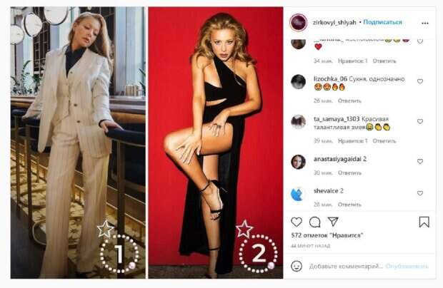 На днях Кароль опубликовала фотографию в белом костюме и "Звездный путь" решил сравнить красотку, добавив другой образ тины - в платье с вырезом от бедра. "Костюм vs платье На днях Тина Кароль порадовала стильным строгим образом. Для фотосессии певица выбрала костюм, а не изысканное платье, и фанаты оценили эксперимент звезды. А какая Тина вам нравится больше? 1 или 2? Делитесь в комментариях", - написано было под фото. Фанаты поставили сотни лайков и написали комментарии: "Тина богиня во всем", "Супер, шикарная в любом образе", "Платье однозначно", "Костюм", "Красивая талантливая змея". Напомним, Кароль не постеснялась показать, как выглядит без косметики в повседневной жизни А еще Politeka писала, что Кароль повеселилась на камеру и устроила вечер игривых танцев Также Politeka сообщала, что Тина Кароль в дизайнерском розовом платье с вырезом показала главные достоинства