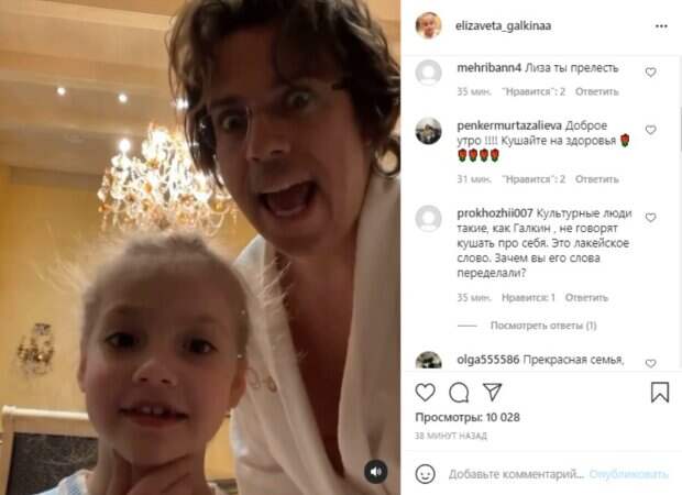 На кадрах Максим предстал в несколько растрепанном виде и в белом халате. Отец обескуражил дочку внезапным вопросом. "Что мы будем сейчас делать?", - спросил он у девочки. "Не знаю даже...", - Лиза задумчиво потерла подбородок. "Есть!", - воскликнул Галкин. "Да! Точно!", - обрадовалась его дочка. При этом на заднем фоне были слышны булькающие звуки, будто кто-то что-то взбивает ложкой. Милая "сценка" настолько понравилась публике, что фанаты решили поделиться ею в Сети, подписав кадры: "Ураааа, кушать!❤️". Пользователи кинулись комментировать увиденное: "Прекрасная семья, хочется, чтобы таких было большинство!!!" "Культурные люди, такие, как Галкин, не говорят кушать про себя. Это лакейское слово. Зачем вы его слова переделали?" "Приятного аппетита" "Супер!!!