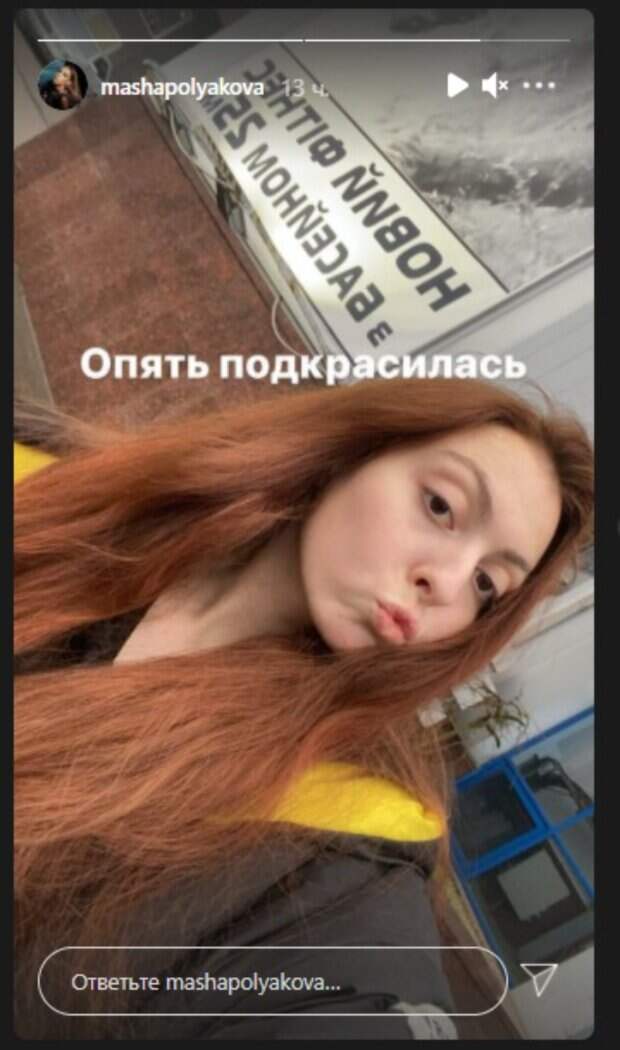 Заметно, что она не стала краситься, ведь главный акцент - ее роскошные волосы. Недавно красотка перекрасилась из темной шатенки в рыженькую. Судя по всему, Маша теперь никак не налюбуется новым цветом. Более того, дочка Поляковой сделала оттенок еще насыщеннее. "Опять подкрасилась", - говорится в подписи. До этого Маша спрашивала у публики, что они думают о ее переменах во внешности. Стоит отметить, мнения разделились. Некоторые утверждают, что девушке было лучше с прежним, натуральным, цветом волос. Другие поддержали юную красотку в ее желании выделяться. Сама же Маша так отреагировала на "негативные" комментарии: "У меня был рыжий под тон, так что я не осветляла". "Не плохо, но свой цвет уже не вернешь никогда