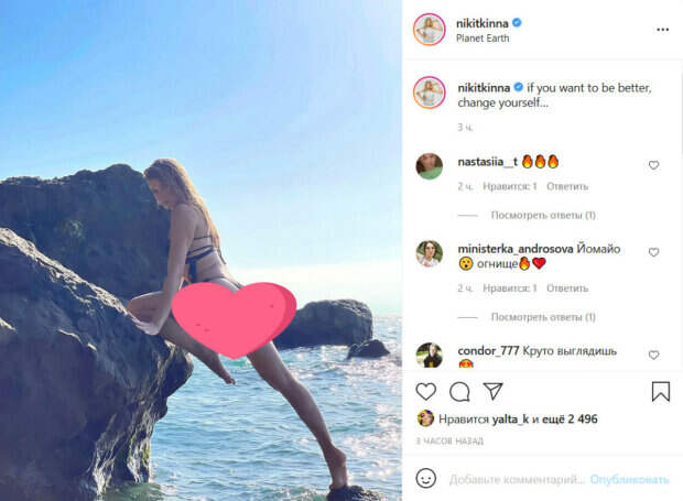 На нем юмористка позировала на пляже, облокотившись на один из огромных прибрежных валунов. Для пляжного отдыха Екатерина выбрала интересный купальник-бикини черного цвета. Он отличался от других подобных моделей большим количеством завязок на лифе. Никитина облокотилась на валун коленом одной ноги, а вторую соблазнительно вытянула сзади, опираясь на нее своим весом. Такая поза позволила артистке продемонстрировать не только свою фигуру, но и отличную растяжку. «Если хочешь быть лучше, меняй себя», - подписала снимок Екатерина. Ее поклонники не смогли пройти мимо такого поста. «Йомайо огнище», «Круто выглядишь», «Афродита», «Я к такому (Екатерина) был не готов!) завтра иду - к психологу!)», «Блин, ты красивая», «Воу, что за прекрасная Ундина», «Леди невероятной красоты. Вот какая нимфа в настоящей жизни», «ух какое филе у курочки», «Ах, чето персиков захотелось))», - пишут люди. Напомним, блондинка из "Женского квартала" раскрыла, как осуществила свою давнюю мечту. Как сообщала Politeka, блондинка из "Женского квартала" очаровала новым образом с красной помадой. Также Politeka писала, что блондинка из «Женского квартала» высоко задрала ногу в коротком платье, удивив позой.