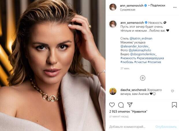 На артистке надето пальто на обнаженное тело, и открыто одно плечо. "Нежность. Пусть этот вечер будет очень теплым и нежным. Люблю вас", - так она подписала свое фото. На шее у Семенович массивная золотая цепь, а на руке серебряный браслетик. Также можно увидеть массивное золотое кольцо на пальце артистки. Макияж на ней довольно сдержанный - в нюдовых оттенках, а прическа имитирует "влажный эффект". В комментариях фолловеры выразили восхищение внешностью Семенович и рассказали, как она их вдохновляет. "Какой красивый кадр получился. Поймал таки фотограф. Настоящая. Конфетка кому-то же такая достанется. Ночи будут горячими...", "Уххх реально огненная дама", "Спасибо. Вам желаем того же", "Какие красивые глазки", "Красотка", "Огонь", "А мы любим вас", "Красивая! Супер леди", "Хорошая какая Аня", - пишут в комментариях. Напомним, пышногрудая Семенович приспустила пальто, под которым не оказалось одежды. А еще Politeka писала, что пышногрудая Семенович в развратных платьях взбудоражила размером декольте. Также Politeka сообщала, что фигуриста Семенович испытала белье на прочность, выбрав неподходящий размер.