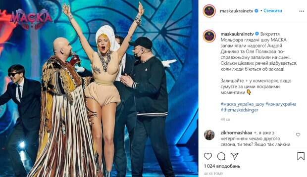 Михаил Хома (DZIDZIO), в своем ярком образе и Оля Полякова, не менее эпатажна с руками поднятыми вверх. Знаменитости На шоу сидели рядом и решили подогреть интерес к событиям поцелуем. "Друзья, не отказывайте себе в удовольствии принимать эмоциональные решения. Потому что они о любви", - написали о поцелуе организаторы шоу "Маска". В паблике прокомментировали кадры словами: "Разоблачения Мольфара зрители шоу маска запомнили надо! Андрей Данилко и Оля Полякова по-настоящему зажгли на сцене. Сколько интересных вещей происходит, когда люди бьются об заклад!" Также украинцев призвали оставить + в комментариях, кто скучает по шоу. Поклонникам понравилось забавное фото, хотя особой активности на странице уже не наблюдается, они написали: "Это не запал на сцене он пел это был его момент, а они бегают там как *обнуті единственный ваш прокол... ". "+скорбим по Андрею Данилко больше всех". "+++ Конечно скучаю за этими моментами. Потому как, именно раскрытие Мольфара было самым ярким и запоминающимся!!! Мольфар лучший!!!❤️❤️" Напомним, что страстный поцелуй Поляковой и DZIDZIO на шоу "Маска" не на шутку разозлил украинцев: "+ ковид получим". Как сообщала Politeka DZIDZIO в костюме засветился под ручку со звездой "Вечернего Квартала" Еленой Кравец: "будет очень-очень" Также Politeka писала, что "Брак DZIDZIO трещит по швам? ": Михаил Хома выдал Осадчей, что происходит в его семье