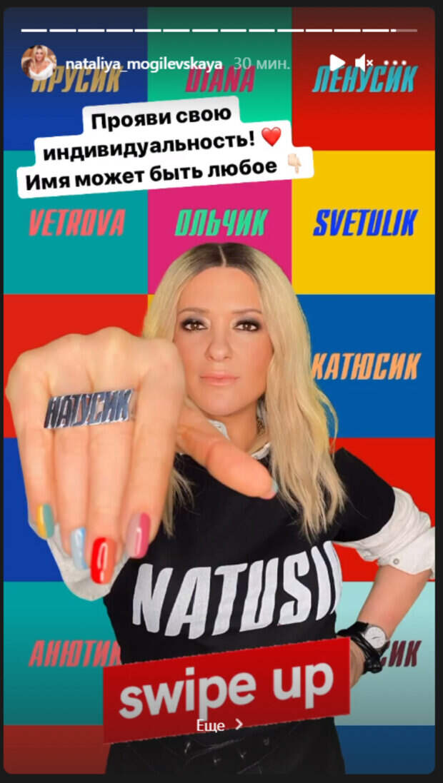 На пальце у Могилевской красовалось кольцо с ее именем «Натусик». Как известно, недавно вышла одноименная песня артистки. «Прояви свою индивидуальность. Имя может быть любое», - загадочно подписала фото звезда. Как оказалось, Могилевская решила покорить мир моды, использовав свой хит для продажи аксессуаров и одежды. «Культ собственного имени - отличный способ поверить в себя», - заявила Могилевская. Отметим, что Наталье Могилевской 45 лет, но она продолжает держаться на плаву в украинском шоу-бизнесе, постоянно пробуя что-то новое. Свой последний хит Могилевская записала с молодыми исполнителями, оставив в своей песне отсылки к популярным песням российских рэперов. Ранее мы писали, что Наталья Могилевская разлеглась на диванчике в белом костюме. Сверху красотка набросила леопардовую шубку. Певица выглядела потрясающе. Именно в таком образе она появилась в своем свежем клипе. Напомним, что Могилевская разговорилась о любви к бывшему, заинтриговав до предела: "Ох, Наташа...". А еще Politeka писала, что закутанная Могилевская в снегу решила "потягаться" с Осадчей, эффектные кадры: "Надо радоваться!". Также Politeka сообщала, что 45-летняя Могилевская с "мужским" голосом поставила на место юную красотку, видео: "Я про себя, вообще-то".