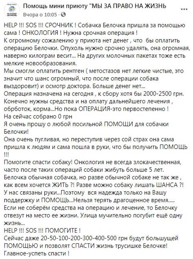 К сожалению, в приюте нет денег на операцию, поэтому волонтеры обратились за помощью ко всем неравнодушным. "Опухоль нужно срочно удалять, она огромная, наверное килограмм весит... На других молочных пакетах тоже есть мелкие новообразования. Мы смогли оплатить рентген (метастаз нет, легкие чистые, это значит что шанс огромен, что после операции собака выздоровеет) и осмотр врача. Больше денег нет. Операция назначена на сегодня, к сбору хотя бы 2000-2500 грн. Конечно, нужны средства и на оплату дальнейшего лечения, обработок, корма... Но пока операция - это первоочередное", - говорится в сообщении. Волонтеры также рассказали, что на самом деле Белочка очень всех боится, но переступив через свой страх она сама пришла к людям, чтобы получить помощь. "Если не соберем средства на операцию и лечение, то Белочку отвезут на место ее жизни. Улица болезненно погубит еще одну жизнь", - говорится в сообщении. Напомним, под Днепром ветеринары спасли собаку, которую хозяева принесли на усыпление: трогательные кадры. Также Politeka сообщала, что история Криворожского Хатико растрогала украинцев до слез, кадры: "Три года жил на могиле хозяина и...". Ранее Politeka писала о том, что пес из Харькова целый месяц добирался из нового дома к старым хозяевам: душещипательное видео.