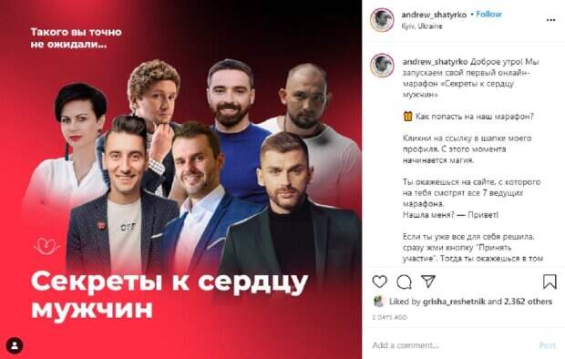 "Мы запускаем свой первый онлайн-марафон «Секреты к сердцу мужчин». Кликни на ссылку в шапке моего профиля. С этого момента начинается магия. Ты окажешься на сайте, с которого на тебя смотрят все 7 ведущих марафона. Нашла меня? — Привет!", - заманивает приглашение. - "Если ты уже все для себя решила, сразу жми кнопку "Принять участие". Тогда ты окажешься в том разделе сайта, где сможешь выбрать подходящий пакет участия и занять место в марафоне". Пользователи социальной сети возмутились таким поступком звезд и раскритиковали даже саму "холостячку" Ксению Мишину: "Вам бы всем к психологу сходить и разобраться в себе, а не давать советы другим"; "Как об отношениях могут чет рассказывать 30летиние холостяки?без детей и опыта совместной жизни"; "Ребята, сходите на марафон "секреты к сердцу женщины", вам явно нужнее"; "Ксения на рекламе деньги заколачивает, эти на марафоне ) проект конечно про чувства
