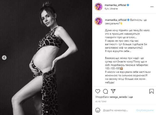 В своем Instagram красотка недавно выложила смелые кадры, на который показала беременный живот во всей красе, и поделилась своими впечатлениями от этого состояния. На новых фотографиях – цветной и черно-белой Анастасия запечатлена в интересном леопардовом платье, которое едва прикрывает интимные места, оголяя стройные ноги и растущий беременный живот. Ее волосы собраны в небрежную прическу, а на лице легкий макияж, она загадочно смотрит в объектив. В подписи к публикации MamaRika поделилась своими переживаниями и впечатлениями от беременности. "Беременность – это с*ксуально? Хочу поднять эту тему, потому что мало кто в принципе решается говорить об этом вслух… Я сейчас не о сексе во время беременности - здесь больше подошел бы заголовок: миф или реальность. Я об ощущении себя… Считаю, что женщина беременна – это супер хот! Знаете, почему? Потому что я себе нравлюсь такой, в габаритах 100-100-100. Я никогда не чувствовала себя настолько женственной и сильной одновременно, я на своем месте больше чем когда-либо! Мы даем жизнь, даем начало нового! ВОУ, у меня мурашки до сих пор по коже, когда осознаю, что со мной происходит прямо сейчас и насколько это круто!", - поделилась Настя. Напомним, Певица MamaRika поделилась откровением о своей первой беременности: "Мы оба плакали. ..". Как сообщала Politeka, Певица MamaRika после объявления о беременности показала, как выглядит с животом в коротком платье: "Я счастлива". Также Politeka писала, Известная украинская певица MamaRika рассекретила беременность, первое фото: "Ничего себе!".