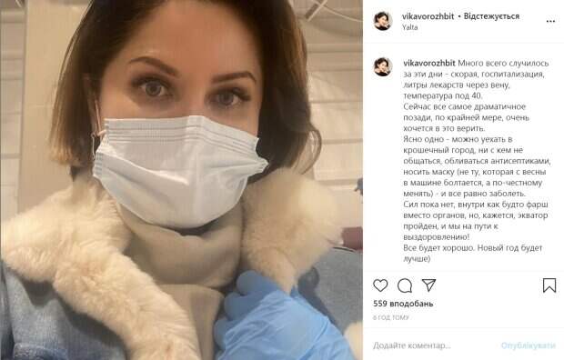 «Много всего случилось за эти дни - скорая, госпитализация, литры лекарств через вену, температура под 40. Сейчас все самое драматичное позади, по крайней мере, очень хочется в это верить», - написала она. Вместе с тем, женщина пишет, что ее самочувствие далеко от нормы. «Сил пока нет, внутри как будто фарш вместо органов, но, кажется, экватор пройден, и мы на пути к выздоровлению», - отметила Ворожбит. Любовница Жигунова утверждает, что она придерживалась всех предписаний, чтобы не заразиться. «Ясно одно - можно уехать в крошечный город, ни с кем не общаться, обливаться антисептиками, носить маску (не ту, которая с весны в машине болтается, а по-честному менять) - и все равно заболеть», - утверждает она. Отметим, пара сейчас проживает на даче актера в Крыму. Сам Жигунов также был госпитализирован с китайским вирусом. Напомним, ранее сообщалоь, что Сергей Жигунов решил даже развестись с женой ради Виктории Ворожбит, которую сравнивают с Анастасией Заворотнюк. Напомним, что Жигунов бросил жену ради новой "копии" Заворотнюк: скандальные детали и фото разлучницы Как сообщала Politeka, экс-жена Жигунова, которую актер променял на Заворотнюк, огорошила признанием. Также Politeka писала, что Жигунов бросил жену ради новой "копии" Заворотнюк: скандальные детали и фото разлучницы.