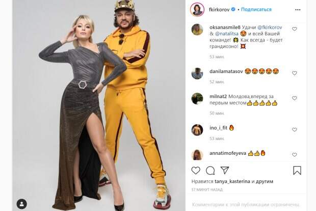 net. На снимке Филипп Киркоров стоит с гордо поднятой головой, на которой возвышалась золотая корона, надетая поверх бейсболки. Но столь помпезный головной убор не помешал надеть ему яркий спортивный костюм желтого цвета с черными полосами по бокам, а также между ногами. Завершили образ поп-короля стильные кроссовки с желтыми шнурками и малиновой подошвой. Филипп скрестил руки на груди и широко расставив ноги, стоя позади очаровательной блондинки со стройной фигуркой и длинными ножками. Девушка надела элегантное длинное платье с отливом, которое сияло и переливалось оттенками серого и коричневого. Ассиметричное платье отлично подчеркнуло грудь девушки и сделало акцент на изящной ножке, заметной благодаря смелому разрезу до самого бедра. Дело в том, что Филипп Киркоров решил объявить о своем новом проекте для конкурса "Евровидение-2021", в котором он объединился с молдавской актрисой и певицей Гордиенко Наталией. Именно она позировала на снимке рядом со знаменитым Киркоровым и впечатляла нежным личиком и тонким силуэтом. "Да! Теперь это официально! Мы собираемся покорять Евровидение 2021 вместе с @natalitsa из Молдовы",- подписал свою публикацию Филипп Киркоров, вызвав неподдельный интерес к этому событию у своих фанатов. "Удачи! Ждем высоких результатов! Только вперёд!", "Круто! Молодцы!", "Вот это новость дня, очень ждем!", "Победа в ваших руках!", " Молдова, вперед за первым местом", " WOW",- написали воодушевленные поклонники в своих комментариях. Напомним, вездесущего Киркорова заметили с актерами "Сватов" и разнесли за алчность: "Захотелось денег ещё заработать..." Как сообщала Politeka, Пугачеву и Киркорова настигла весть о кончине близкого человека, подробности трагедии: "Господи, Саша..." Также Politeka писала, что Собчак набросилась на Киркорова из-за поддержки Путина, в России гремит скандал: "Филипп, а где было..."
