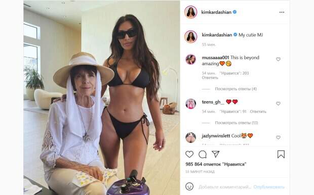В новом посте на своей странице в Инстаграм Ким Кардашьян решила поделиться редким семейным фото с бабушкой. На снимке знаменитость позирует с ней в просторной светлой комнате. Мэри Джо одета в милую белую блузку с кружевными вставками, бежевые брюки и шляпку с белой лентой. А вот на ее внучки одежды гораздо меньше: Ким позирует в одном черном купальнике-бикини. «Моя милашка Эм Джей», - подписала снимок Кардашьян. Ее поклонники пришли в восторг от такого фото. «Это запредельно восхитительно», «Шикарный дуэт», «Мило», «Красивы дамы», «Уверена, Эм Джей перестала стареть примерно 10 лет наза», «Она выглядит замечательно», «Ким, ты уверена, что тебе 40?», «Это круто, но почему на ней одежда, а на тебе нет?», «Как ты можешь так одеваться перед своей бабушкой?», - пишут люди. Напомним, Ким Кардашьян показала достоинства фигуры в прозрачном топе и бикини: «Это невозможно!». Как сообщала Politeka, Ким Кардашьян засветила фигуру как есть в наряде с открытыми боками: фото в новом ракурсе. Также Politeka писала, что Ким Кардашьян в латексном платье с большими вырезами показала себя в процессе примерки: «Сложный выбор».