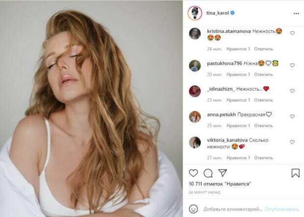 Тонкая белая маечка без принтов с весьма открытым декольте, естественный макияж и в целом «постельный» стиль выглядели очень пикантно. «...и мир- свидетель этой любви...» - загадочно написала Тина под постом. Поклонники поспешили ответить: «Новая песня скоро, мы поняли; это чтоооо, новая песня???