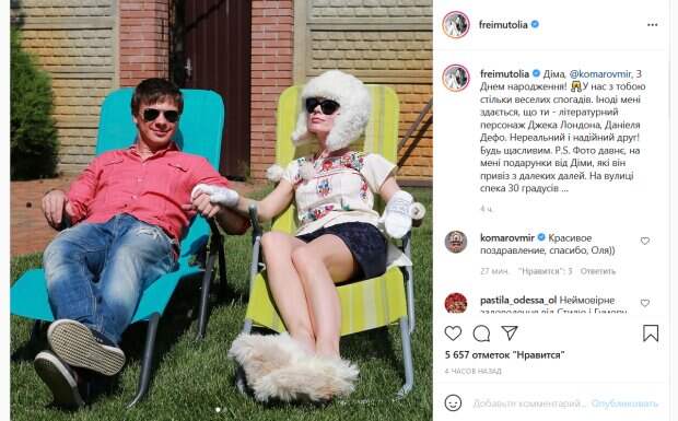 Об этом пишет Politeka.net. Так, Фреймут трогательно поздравила Комарова, подчеркнув, что считает его хорошим другом. «Дима, с днем рождения! У нас с тобой столько веселых воспоминаний. Иногда мне кажется, что ты - литературный персонаж Джека Лондона, Даниэля Дефо. Нереальный и надежный друг! Будь счастливым», - написала ведущая. Она также поделилась яркими совместными фото, на которых она запечатлена в компании Комарова. На снимке ведущие лежат рядом в шезлонгах и держатся за руки. При этом Фремйут одета крайне необычно: на ней блуза с вышивкой, юбка, меховые «тапочки», варежки и шапка-ушанка. Ведущая пояснила, что все это – подарки от Комарова. «Фото давнее, на мне подарки от Димы, которые он привез из дальних далей. На улице жара 30 градусов», - отметила ведущая. В свою очередь, Комаров по достоинству оценил ее поздравление. «Красивое поздравление, спасибо, Оля», - написал он в комментарии. Отметим, что в 2019 году Комаров женился на «Мисс Украина 2016» и партнерше по «Танцям з зірками» Александре Кучеренко. Напомним, Фреймут после нового эксперимента с внешностью резко "состарилась": "На себя не похожа". Как сообщала Politeka, Фреймут призналась, как осталась одна с ребенком на руках и без денег: "Страшное ощущение". Также Politeka писала, что Фреймут на редком видео показала младшую дочь Евдокию: "Вспомнили детство...".