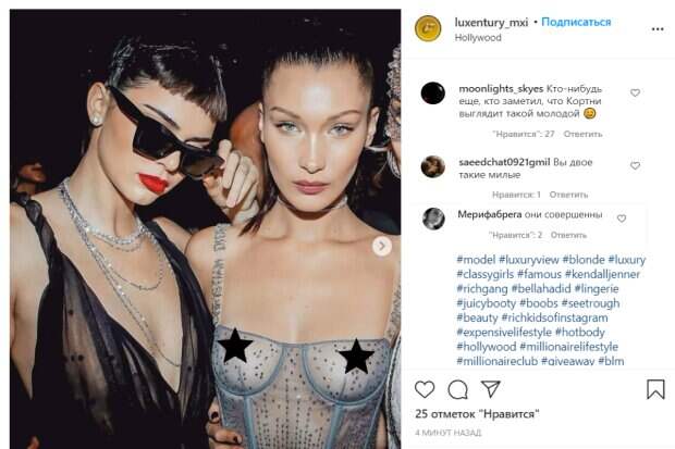 А совсем недавно стали звездами красной дорожки. Снимки красоток появились в сети Instagram. Белла Хадид примерила соблазнительный образ: прозрачное платье, украшенное стразами. Шифоновое голубое платье полностью состояло из прозрачного шифона, небольшие вставки ткани из переливающегося бисера лишь слегка прикрывали тело. Белла надела его без нижнего белья, тем самым сделав образ еще более пикантным. Волосы она собрала в уже привычный пучок, который является ее любимой прической для светских выходов. Нужно отметить, что Белла с ее точеной фигурой и стройными ногами смотрелась в нем просто роскошно. Рядом с ней позирует одна из ее лучших подруг Кендалл Дженнер, знаменитость взяла пример с Беллы и надела прозрачное платье. Но ее образ не столь провокационный, ведь черная ткань лучше скрывает формы, чем нежно-голубая ткань в наряде Хадид. Пользователи сети оставили для девушек множество положительныз комплиментов, отмечая их красоту и обворожительность. "как мило", "КОРОЛЕВЫ красной дорожки", "они совершенны", "Кто-нибудь еще, кто заметил, что Кортни выглядит такой молодой", "Ты и Белла лучшие". Напомним, что знойная Белла Хадид засветила самые аппетитные места в дерзком наряде А еще Politeka писала, что жаркая Белла Хадид сверкнула округлостями в неприличном купальнике Также Politeka сообщала, что мокрая Белла Хадид пошалила на камеру, горячие кадры