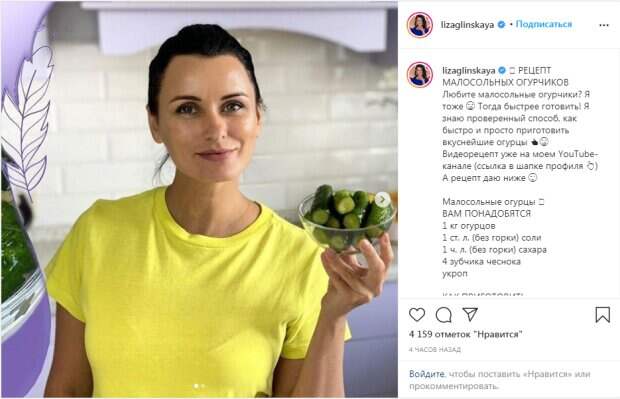 л. соли (без горки); 1 ч.л. сахара (без горки); 4 зубчика чеснока; укроп. Первое, что нужно сделать это поместить в зип-пакет сахар, соль, давленный чеснок и укроп. Следующий этап - подготовить огурцы. Нужно срезать "попки". После чего, их следует отправить в пакет и хорошо перемешать. После проделанных манипуляций, огурцы нужно поместить в холодильник на 10-12 часов. Чтобы они просолились равномерно, в течении этого времени их следует периодически переворачивать. По истечению 12 часов, огурцы можно подавать к столу. " Готово! Можно хрустеть!" - пишет победительница "Мастер Шеф". Подписчики Лизы проявляли активность под её постом, благодарили за отличный рецепт и делились свои опытом соления огурцов. "Я всегда добавляю корень имбиря ,режу его слайсами и пару штук ложу и когда закатываю и просто когда малосолю на покушать!!! Очень хрустят тогда", "Готовлю по этому рецепту уже 7 лет!", "Как просто!" - пишут подписчики Глинской. Напомним, звезда "МастерШеф" Глинская раскрыла простые секреты заготовки ягод: "Не нужно бояться" Как писала Politeka, победительница "Мастер Шеф" Глинская поделилась простым рецептом вкуснейшего французского десерта: «Пальчики оближешь» Как Politeka сообщала, победительница "МастерШеф" Лиза Глинская раскрыла рецепт пахлавы медовой: как в детстве на море