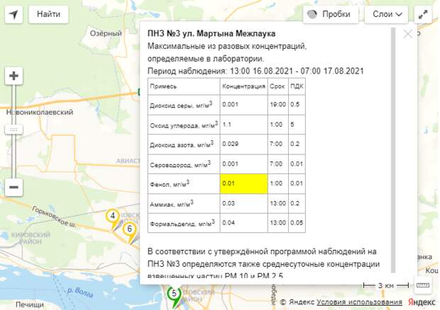 Мартына Межлаука, зафиксировал предельно допустимую концентрацию фенола — 0,01 мг/куб. метр. По данным поста наблюдения №15 (ул. Дубравная) этот показатель составил 0,011 мг/куб. метр. Предельно допустимая концентрация фенола в воздухе — 0,01 мг/куб. метр. Превышение формальдегида зарегистрировала три станции мониторинга. На ПНЗ №4 на Горьковском шоссе, 2 концентрация загрязняющего вещества составила 0,096 мг/куб.метр; на ПНЗ №6 по ул. Степана Халтурина, 10 — 0,07 мг/куб.метр. Пост наблюдения за качеством атмосферного воздуха №7 по адресу: ул. Декабристов, 183, зарегистрировал формальдегид на уровне 0,065 мг/куб. метр. Предельно допустимая концентрация составляет 0,05 мг/куб.метр. Данные представлены за период наблюдения с 13:00 16 августа по 07:00 17 августа.