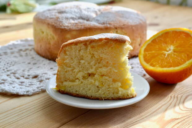 Перемешать венчиком. Влить оливковое масло. Муку отдельно смешать с разрыхлителем. Затем соединить с яичной смесью. Влить апельсиновый сок, перемешать. Тесто вылить в форму. Выпекать пирог 25-30 минут при 180 ℃. [caption id="attachment_49214" align="aligncenter" width="1280"]Ароматный апельсиновый пирог[/caption]