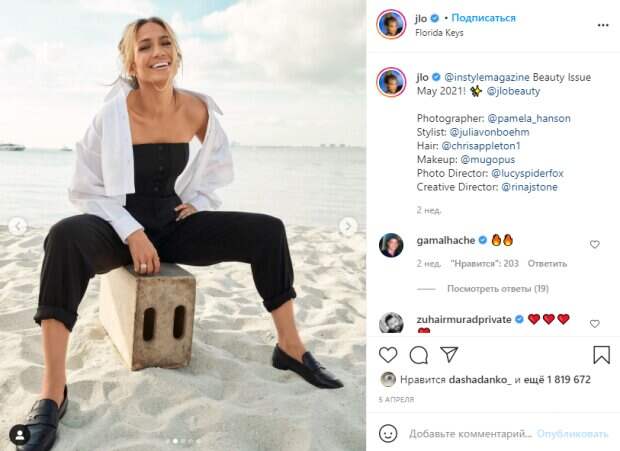 На представленных кадрах прославленная певица без малейшей скромности подчеркнула свои главные достоинства. Идеальный загар, подтянутая кожа и аккуратные формы. В провокативной позе прямо на полу Лопес задрала ногу вверх и подчеркнула привлекательность тем самым благодаря одному лишь движению. Черное прозрачное платье из сетчатой ткани, а также отсутствие белья придали Лопес игривости. Распущенные волосы и макияж дополнили образ дикой львицы, усиливая впечатление. При таких кадрах довольно сложно сказать, что звезде и правда больше 50 лет. Также сама Лопес недавно показала фигуру на пляже в удобных нарядах, не лишенных вкуса и элегантности, но в то же время без лишнего гламура. Сначала знаменитость покуражилась в черном комбинезоне с откытыми плечами и заманчивым декольте, накинув на плечи коротенькую белую рубашку. "Вечная красота"; "Эта улыбка"; "Мне нравится, какая ты всегда честная