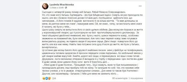 Но папа таки победил "ковид" и уже готовился выписываться домой, как подвело больное и измученное сердце. Дважды врачи возвращали его к жизни, но все имеет предел. Даже такая мощная сила духа и воля к жизни, которые были у отца, исчерпались..." — сообщила Мрачковская. Украинцы искренне сочувствуют семье. «Да будет земля пухом и Вечное Царство в небесах. Мои искренние соболезнования семье», «Пусть Господь будет обитать его там, где покоятся праведные. Семье - сострадание», «Плачу вместе с вами. Сил вам», «Очень жаль ... Ваш отец был действительно великим человеком и сделал много хороших дел ... пусть будет ближе к Богу и оттуда помогает Вам и всем нам», - пишут в Сети. Николаю Рябому в декабре 2020 года исполнилось 84 года. Похоронят его в воскресенье, 3 января. О смерти писателя написал и председатель областной писательской организации Вадим Витковский. "Перестало биться сердце великого патриота Украины, выдающегося писателя Николая Александровича Рябого, который десятки лет своей жизни и титанической творчества романиста на страже украинской государственности держал свое горячее слово", — написал он. Отметим, Николай Рябой — украинский писатель, известный прозаик, публицист, переводчик. Член Национального союза писателей Украины, Национального союза журналистов Украины. Николай Рябый дважды номинировался на соискание Национальной премии Украины имени Тараса Шевченко. В активе писателя более 30 повестей и романов об историческом прошлом Украины и становлении ее государственности. В частности, "33-ий. Маленькая повесть о великом голоде" и роман "Упала звезда Полынь" посвященные аварии на ЧАЭС, романы "Облава на вооруженного волка" и "Вервольф. Хроника "вооруженных волков" рассказывают о строительстве ставки Гитлера под Винницей и борьбу с нацизмом. Перу Рябого принадлежит повесть о выдающемся украинском вирусологе Кирилле Заболотном "Слухи о смерти преувеличены". Николай Рябый перевел, упорядочил и прокомментировал ряд художественных, исторических и духовных книг. Напомним, внезапно оборвалась жизнь известной украинской певицы и волонтера, детали трагедии. Как сообщала Politeka, "10 дней без кислорода" : вирус задушил украинца на больничной койке, дочь во всем винит врачей Также Politeka писала, что "две маленькие девочки остались без отца": остановилось сердце именитого украинца, детали трагедии.
