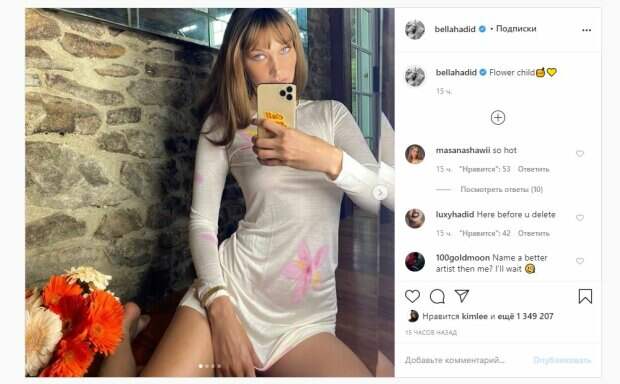 Известная модель Белла Хадид показала необычный образ, порадовав не только фанатов На фото Белла позирует в футболке, сидя на коленях. Красотка решила снять себя без штанов, показывая свои ноги перед зеркалом, пока делала селфи. Хадид держала телефон перед собой, а рядом можно увидеть цветы, которые стояли возле ноги.