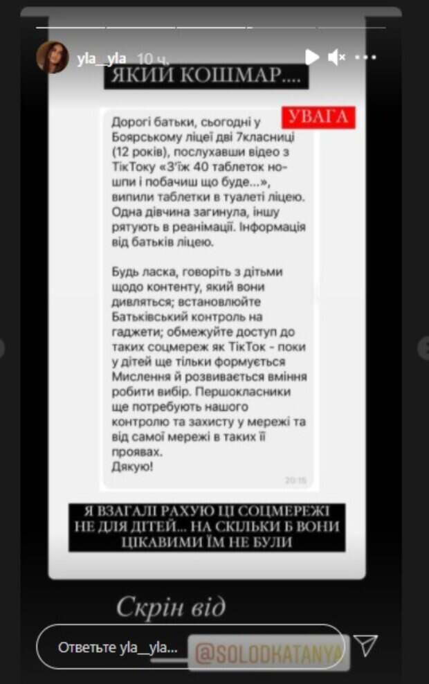 "Какой кошмар... Я вообще считаю, эти соцсети не для детей. На сколько б интересно им не было", - прокомментировала жена Джеджулы. "Пожалуйста, говорите с детьми по поводу контента, который они смотрят; устанавливайте родительский контроль на гаджеты; ограничивайте доступ к таким соцсетям как TikTok - пока у детей еще только формируется мышление...", - говорится в сообщении, которым поделилась Леус. Инцидент произошел накануне в одном из лицеев столицы. Две семиклассницы, посмотрев видео на TikTok, где предлагалось "съесть" 40 таблеток но-шпы и посмотреть, что будет, решили так и сделать. Эксперимент для детей окончилась плачевно. Девочки выпили таблетки в школьном туалете, их обнаржили в бессознательном состоянии. Одну из них медикам не удалось спасти, вторая находится с интоксикацией в реанимации, где ей срочно промыли желудок. Состояние выжившей школьницы расценивается как стабильно среднее. Правоохранители уже установили аптеку и провизоров, продавших лекарства детям. Ранее мы сообщали, Леус, которую зацепила за живое трагедия со школьницами, и сама недавно находилась на грани срыва. Девушка перед новым годом очутилась в больнице. В ухудшении состояния здоровья она обвинила супруга - якобы от него исходит насилие, в том числе и психологическое. Так как своего жилья у Юлии пока еще нет, то, выписавшись из больницы, ей пришлось вернуться к супругу. По поводу того, удалось ли ей наладить отношения с Джеджулой, девушка отметила, что они общаются только по вопросам рождения будущей дочки. Напомним, беременная жена Джеджулы после скандала призналась, с кем теперь будет воспитывать ребенка: "Тяжело..." Как сообщала Politeka, беременная жена Джеджулы после больницы показала себя в постели и рассказала о болях: "Это невыносимо!" Также Politeka писала, что жена Джеджулы показала, как зажигала "под градусом" в клубе: "А пьяненькую можно?"