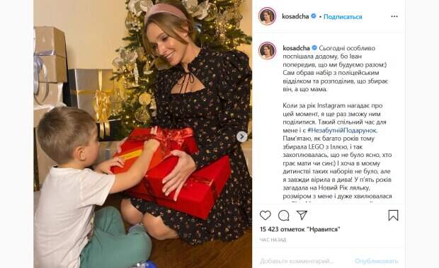 «Сегодня особенно спешила домой, потому что Иван предупредил, что мы строим вместе :) Сам выбрал набор с полицейским участком и распределил, что собирает он, а что мама. Когда за год Instagram напомнит об этом моменте, я еще раз смогу им поделиться», - написала ведущая. На новых фото она с сыном позирует на фоне елки. Сначала они вместе открывают подарок, а затем начинают собирать конструкцию по задумке маленького Ивана. Осадчая при этом одета в милое черное платье в цветочек, а на ее голове красуется розовый ободок. Поклонники ведущей тут же отреагировали на ее пост. "Образ очень классный", "Иван уже такой большой", "Очень милая фотография. Катерина, выкладывай фото с семьей почаще", "Для ребёнка побыть с мамой и папой- самая лучшая радость! Вы чудесные", "Красавица мама и сыночек", "Рядом с сыном Катерина выглядит как старшая сестра, такая маленькая, красивая", - пишут люди. Напомним, Горбунов из "Голос країни" ошеломил забавами с подросшим сыном, Осадчая все пропустила: "Папаня молодец". Как сообщала Politeka, Осадчая тайком засняла, что вытворяют Каменских с Потапом во время шумного застолья: "Ух ты, какие...". Также Politeka писала, что эффектная Осадчая покрутилась перед зеркалом, соблазнив сочными изгибами: как Горбунов это терпит.