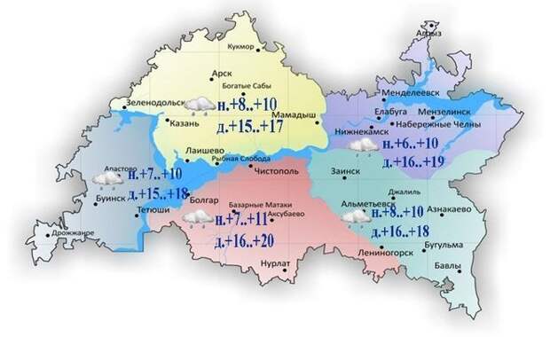 +18 градусов. Фото: realnoevremya.ru Также днем местами синоптики прогнозируют грозу. В республике ожидается юго-западный умеренный ветер, местами сильный порывами до 15—20 м/с. На следующей неделе в Татарстане наступит потепление. По данным Гидрометцентра республики, в понедельник и вторник ночью ожидается до +7..+13 градусов. Днем воздух прогреется до +19..+25 градусов.