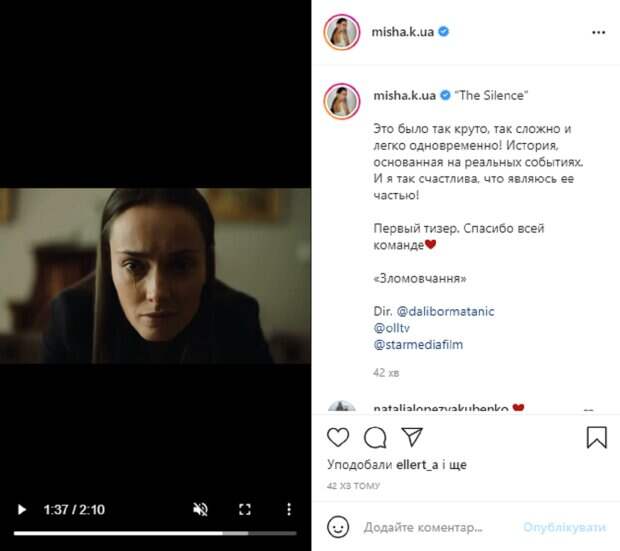 В начале весны звезда сообщила поклонникам, что стала героиней нового украинско-хорватского сериала "Зломовчання", основанного на реальных событиях. Теперь же актриса поделилась первым тизером картины, опубликовав видео в своем микроблоге. Судя по кадрам, сериал будет весьма драматичным и даже криминальным, а героиня Ксении очень необычной. В тизере несколько раз сплывают кадры с Мишиной, на которых она выглядит очень драматично. Стоит отметить, что съемки проходили в двух столицах – Киеве и Загребе, а Ксения выучила хорватских язык, чтобы сыграть свою роль. В подписи к ролику актриса написала: "The Silence". Это было так круто, так сложно и легко одновременно! История, основанная на реальных событиях. И я так счастлива, что являюсь ее частью! Первый тизер. Спасибо всей команде. «Зломовчання»". Пользователи тут же принялись обсуждать тизер нового сериала: "Как прикольно", "Когда будет премьера?", "Это очень «вкусно». Жду с нетерпением премьеру", "Очень круто, жду премьеру". Напомним, "Холостячка" Мишина показала, в каком виде пришла на первое свидание с Эллертом: "Обожаю". Как сообщала Politeka, Мишина удивила переменами во внешности, "Холостячку" не узнать: "Будто Надя Дорофеева". Также Politeka писала, Ксения Мишина в фартуке "Мастер Шеф" залепила пощечину Хименес-Браво: "Бедный Эктор".