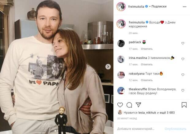 Нужно сказать, что сама Фреймут не часто радует поклонников совместными снимками с супругом. Однако сегодня, в день рождения мужа, теледива решила сделать исключение и опубликовала на своей странице в Instgaram семейное фото, сопроводив его кратким поздравлением. «Володя, с днем рождения», - подписала она. На первом снимке Ольга в уютной домашней атмосфере позирует в обнимку с именинником, на втором – телеведущая показала праздничный тортик. Фолловеры присоединились к поздравлениям в комментариях, среди них оказалась известная телеведущая Леся Никитюк. "Поздравляем с праздником вашего мужа, и всю вашу невероятную семью)